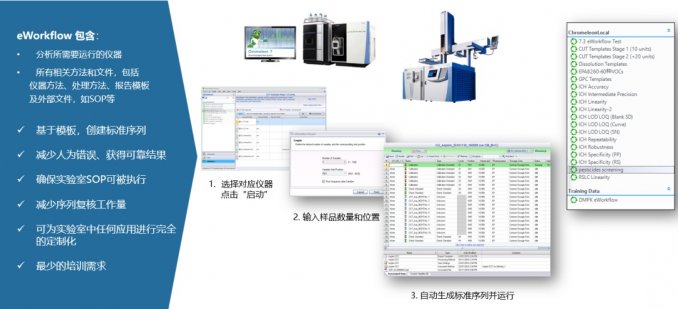 eWorkflow是Chromeleon內(nèi)置的標準功能,可基于預設的模板自動創(chuàng)建標準序列,包含固定格式的序列表、既定的儀器方法、處理方法、報告模板等,減少人為創(chuàng)建或引用文件錯誤等情況,進而也大大減輕雙人復核的工作量。對于方法驗證或批次檢樣等“標準化流程”,可實現(xiàn)一鍵運行序列。