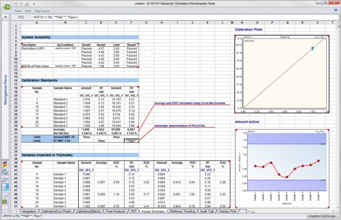 Chromeleon專業(yè)的報告設計器功能,內(nèi)嵌豐富的公式函數(shù),滿足用戶各類計算的需求,如制作標曲、含量計算等,可完全替代外部計算工具;所有數(shù)據(jù)均與序列動態(tài)關聯(lián),避免人為謄抄,完全杜絕了數(shù)據(jù)轉(zhuǎn)移的風險。